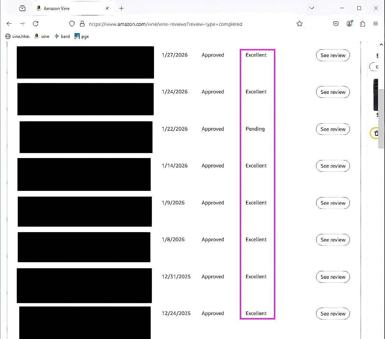 So starting on September 1st 2025, Vine implemented a scoring system where >>if you don't write "excellent" reviews, they fire you within six months.