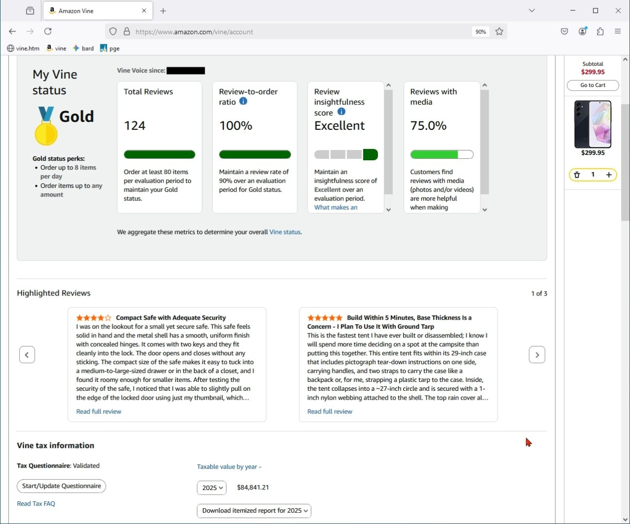 Once invited, Amazon Vine gives you up to about $300K per year in product >>that you choose, but as Chris noted, the freebies count as income to the >>Feds (although you pay no sales tax and no shipping so it can net out).