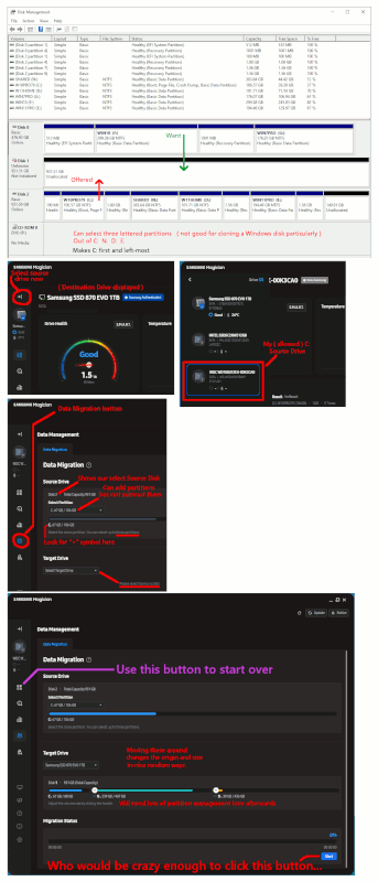 I looked at you tube videos about using Samsung Magician. They all showed a ssd that did not look like my SATA drive.-a Samsung Magician seems to have 2 ways to get to "Data Migration". One way pops up a message that the drive isn't compatible. I originally feared that it was warning me that the new drive wasn't compatible with my computer. Going in the other way, it shows my C: drive as the source drive but it prompts me to connect the Samsung SSD. It doesn't see it even though it IS there and it works.