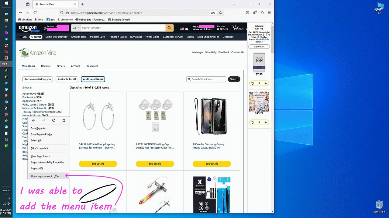 And the source to https://example.com came up in an editable gVim session! Likewise with the HTML text "file:///C:/data/amazon/vine.htm" file edits.