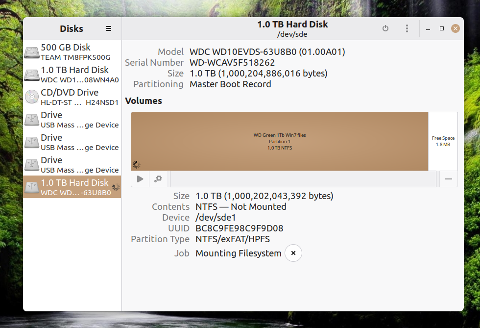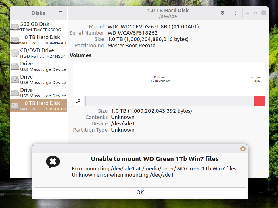 I noticed a second drive in a Win7 PC was not in File Exploiter, and didn't appear in file management, so I tried it in a couple of other PC's, same thing. When I put it in my Linux 22 box it appears unmounted but LM tries to mount it viz:sudo apt install smartmontools # Most likely, already installed