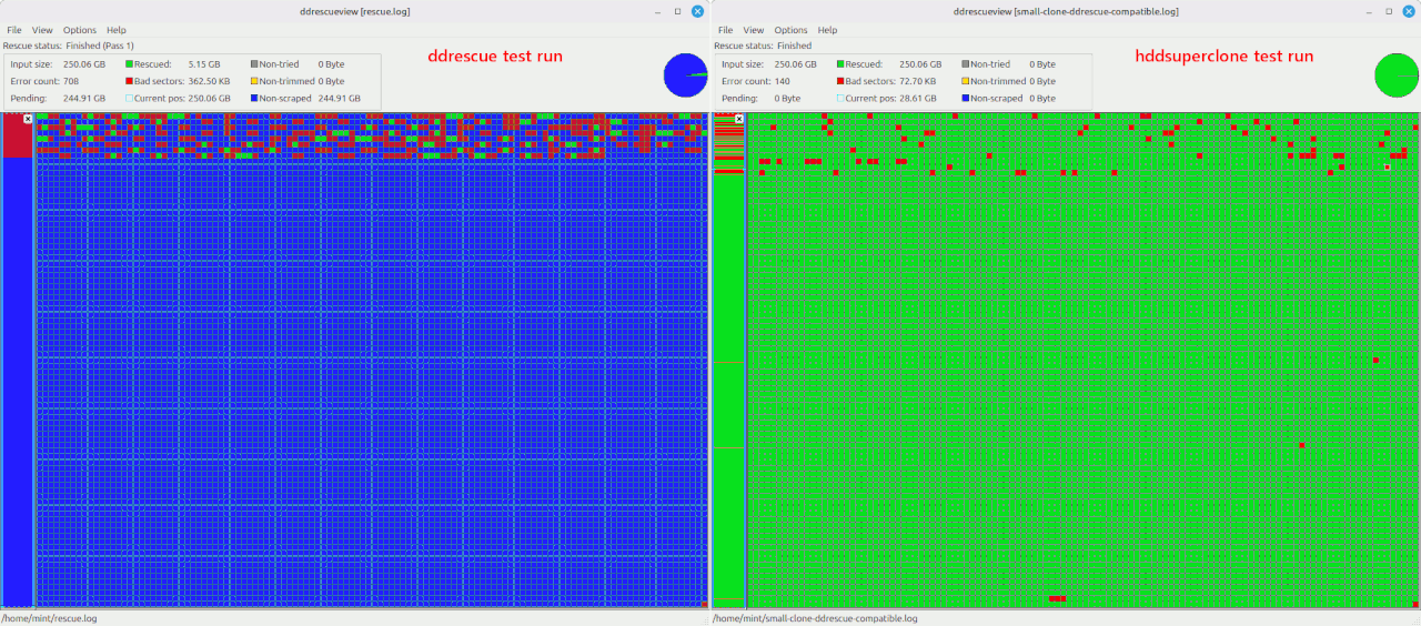 sudo ddrescue -d -f -r3 /dev/sde /def/sdf /root/rescue.log # Try to recover the remaining damaged sectors