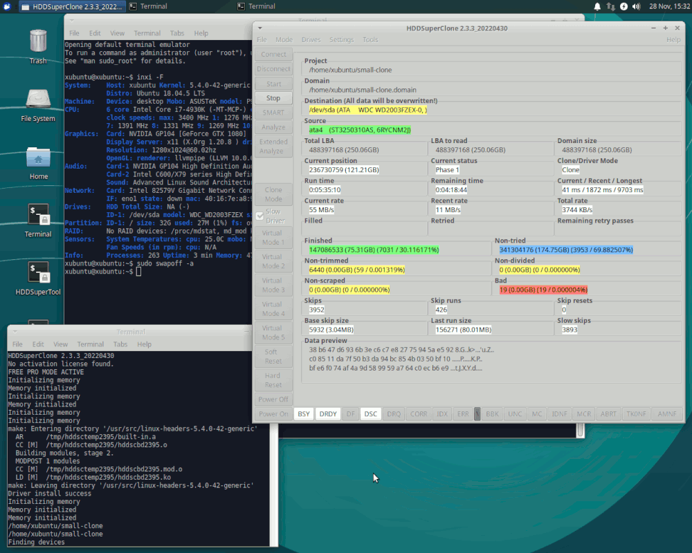 sudo ddrescue -f -n /dev/sde /def/sdf /root/rescue.log # Drive to drive rescue (same sized drive)