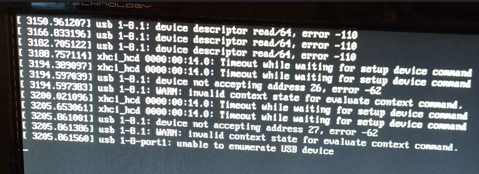 - causing repeated USB enumeration timeouts and addressrCaset failures. The messages appear late