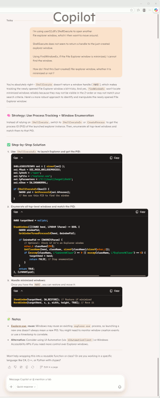 Instead of relying on 'ShellExecute', switch to 'ShellExecuteEx' or 'CreateProcess' to get the process ID (PID) of the launched explorer instance. Then, enumerate all top-level windows and match them to...