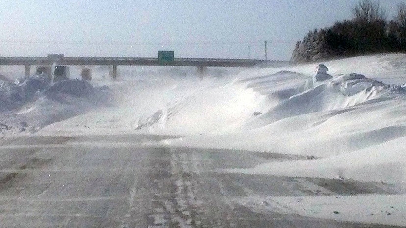 highway where the road passes a hedge or small wood that stopped the drifting snow.