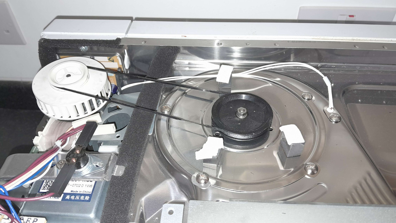 wafts around the heat in conventional-oven mode. Here's a picture of the belt back in position: visible in the pic is a section of the belt which seems to be stretched (and possibly melted?).